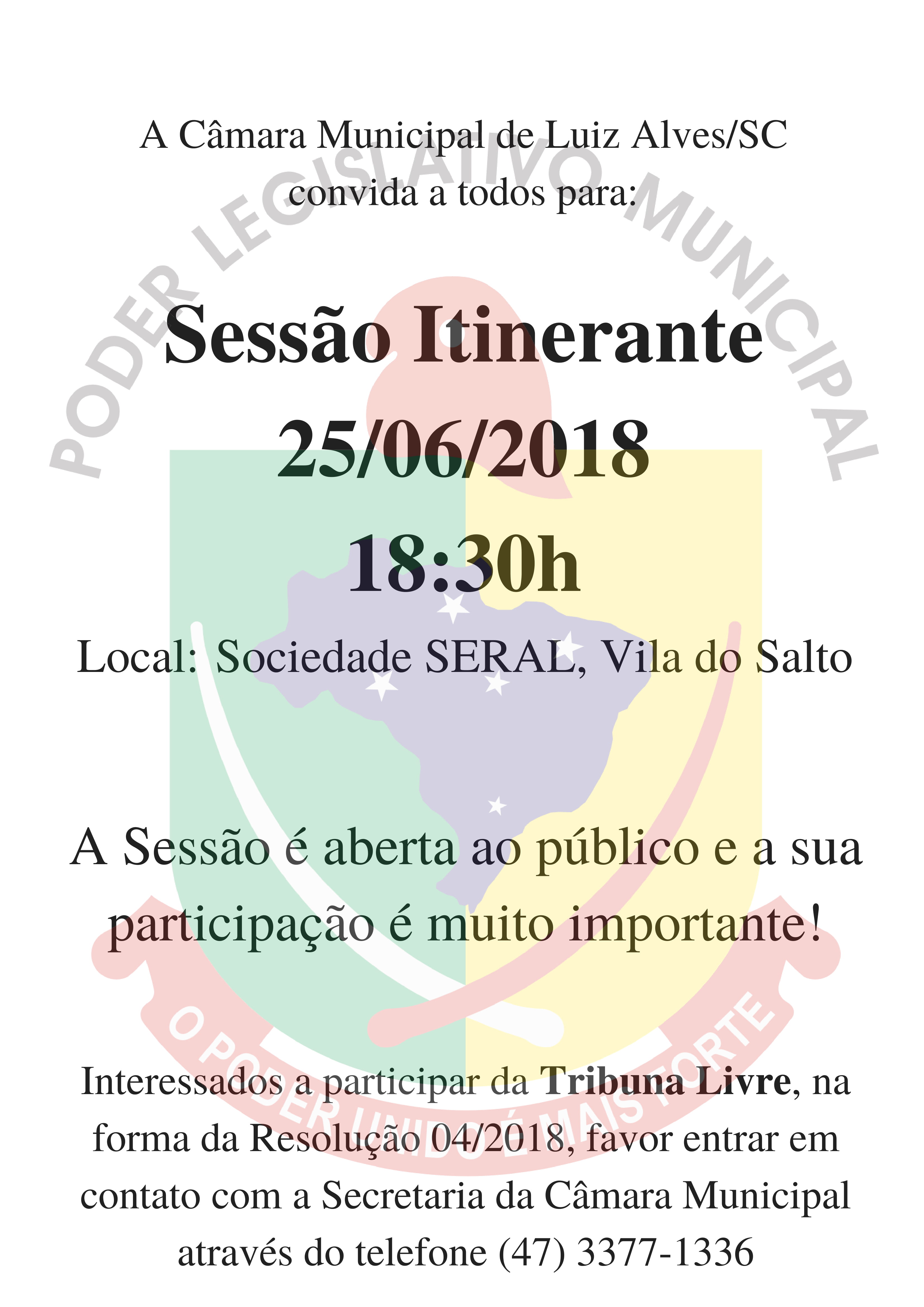 A Câmara Municipal convida a todos para participar da 1ª Sessão Itinerante a realizar-se no dia 21 de maio de 2018 no Salão da Igreja São João Batista, Braço Serafim, com início às 18 h e 30 min. Sua presença é muito importante.